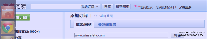 在有道閱讀器頁面上點擊“添加訂閱”,輸入我們的地址:www.usfk.org , 點“搜索”,其將自動識別我們的RSS,得到如下圖的提示: