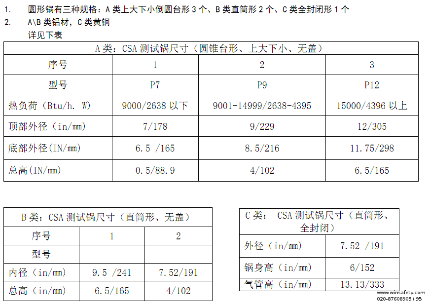 CSA 測(cè)試鍋型號(hào)規(guī)格